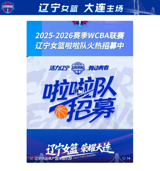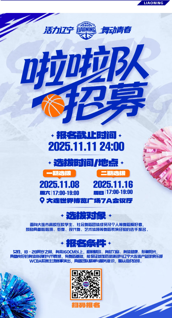 為塑造獨具特色的主場賽事文化,提升遼寧大連體產(chǎn)籃球俱樂部的品牌影響力,現(xiàn)正式組建一支兼具專業(yè)水準與青春活力的專屬啦啦隊,為球隊助威、為賽場添彩。我們面向大連市高校在校學生、社會舞蹈團體成員及廣大舞蹈愛好者公開招募。新成立的啦啦隊將全程參與遼寧大連體產(chǎn)籃球俱樂部主場比賽,承擔現(xiàn)場表演、氣氛帶動、球迷互動及球隊形象推廣等工作,以青春風采點燃賽場激情,展現(xiàn)當代青年的朝氣與魅力。