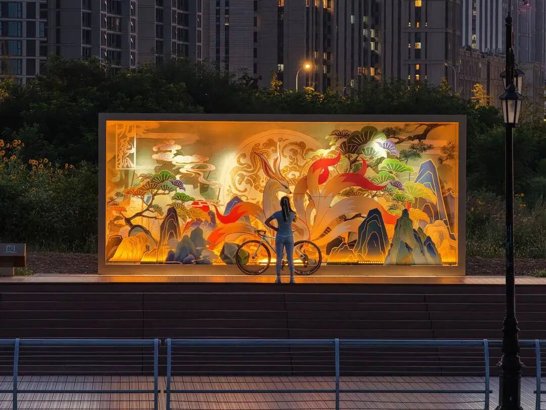 踏入山海經文化休閑棧道,一場穿越千年神話的光影奇旅瞬間開啟。約1200米的棧道,宛如一條時光隧道,將《山海經》的文化元素巧妙融入。7處大型立體繪本藝術裝置錯落分布,九尾狐、金烏等靈獸栩栩如生,共工觸山、女媧補天等傳說躍然眼前。白晝時分,陽光灑在裝置上,散發(fā)著神秘氣息;夜幕降臨,光影交織,古老神話仿佛觸手可及。來自鄭州的游客何琦興奮地說:“白天看這些裝置,就覺得特別精美,晚上燈光一亮,感覺真的走進了神話世界,太神奇了!”