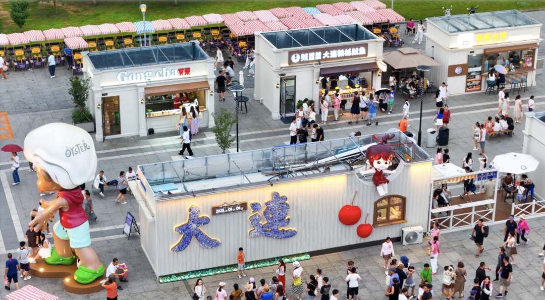 “東港·原點里”街區(qū),是潮玩夜生活的時尚新主場。300米的街區(qū),北側檔口、南側店鋪、中央步道、游艇港岸線觀景露臺布局精巧。漫步其中,點一杯咖啡,看游艇在波光中穿梭,落日余暉灑在身上,遠處噴泉盛宴正酣,濱海不夜城的獨特魅力盡顯。街區(qū)負責人張譯丹介紹:“此次升級,還原了部分城市記憶場景,新增的大連城市文化展廳、闖關東主題雕塑等實物展陳,讓游客在游玩中感受城市的歷史脈絡。”