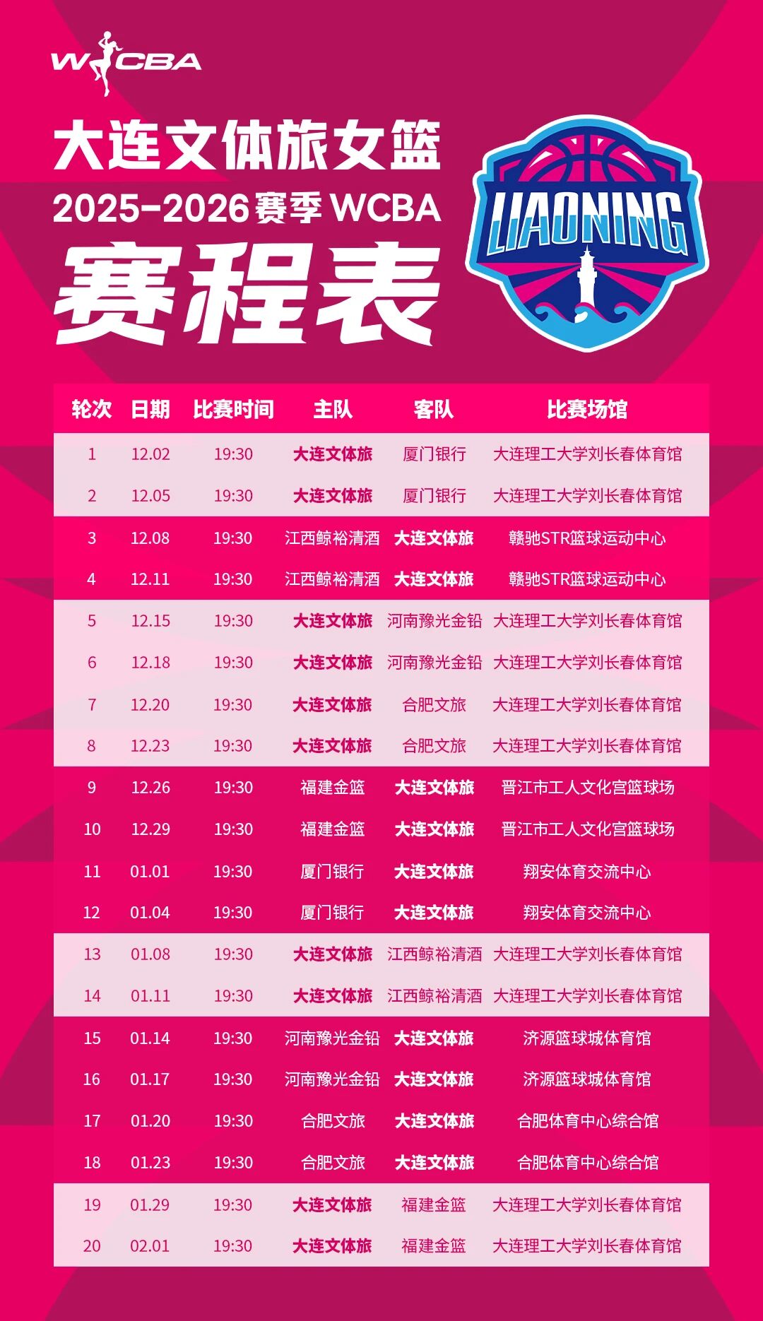 2025-2026賽季中國女子籃球聯(lián)賽(WCBA)官方賽程表已公布,大連文體旅女籃新賽季首場(chǎng)比賽將于2025年12月2日拉開帷幕,揭幕戰(zhàn)大連文體旅女籃坐鎮(zhèn)主場(chǎng)——大連理工大學(xué)劉長春體育館,迎戰(zhàn)廈門銀行。詳細(xì)賽程表見下圖,歡迎廣大球迷朋友們收藏。