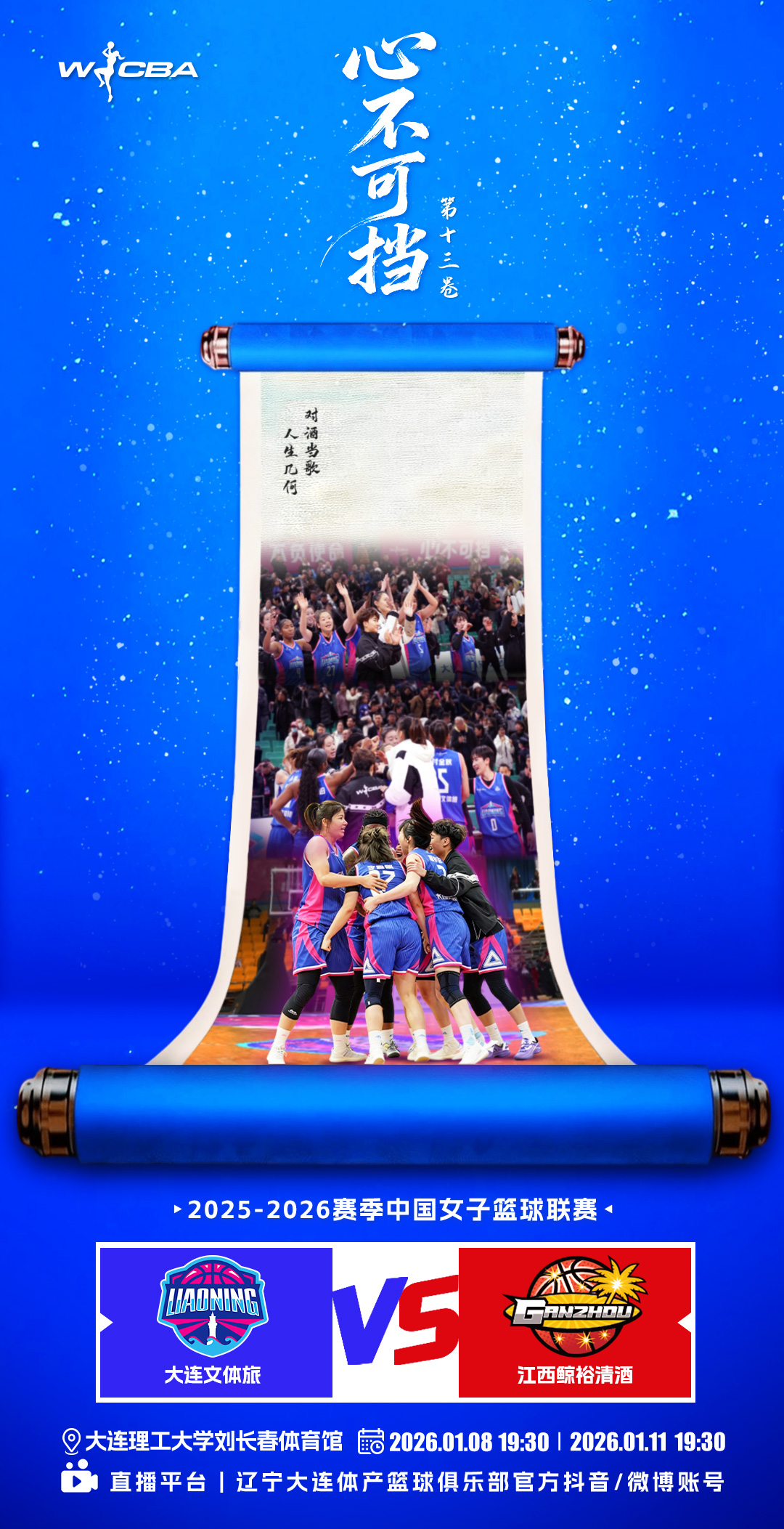 新年新勢,銳不可當;主場新章,力不可阻。2026年的首個主場戰(zhàn)役,即將在大連理工大學(xué)劉長春體育館熾熱開啟。我們迎來的不僅是一場比賽,更是一次全新的出發(fā)——以信念為起點,以拼搏為步伐,以團隊為力量,開啟屬于大連文體旅女籃的嶄新篇章。1月8日19:30,官方抖音、微博賬號全程直播。這一次,我們共同見證:新程已啟,其勢難擋!